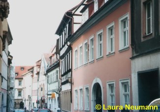 violett: Haus zur Trommel (Judenstraße 17). Dieses Haus tritt heute noch wie damals hinter die Straßenfront zurück. |