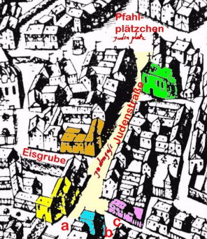 | Die Judenstraße ("Judengass") verläuft vom Pfahlplätzchen ("Jüdenplatz") in südlicher Richtung; sie endet abrupt am Haus zum Einhorn (Judenstraße 16; blau). Dies war in der mittelalterlichen Städteplanung Absicht, um kalte Winde zu brechen! So teilt sich die Judenstraße an ihrem Ende in drei Straßen: Unterer Stephansberg (a), Concordiastraße (b) und Schimmelsgasse (c). |